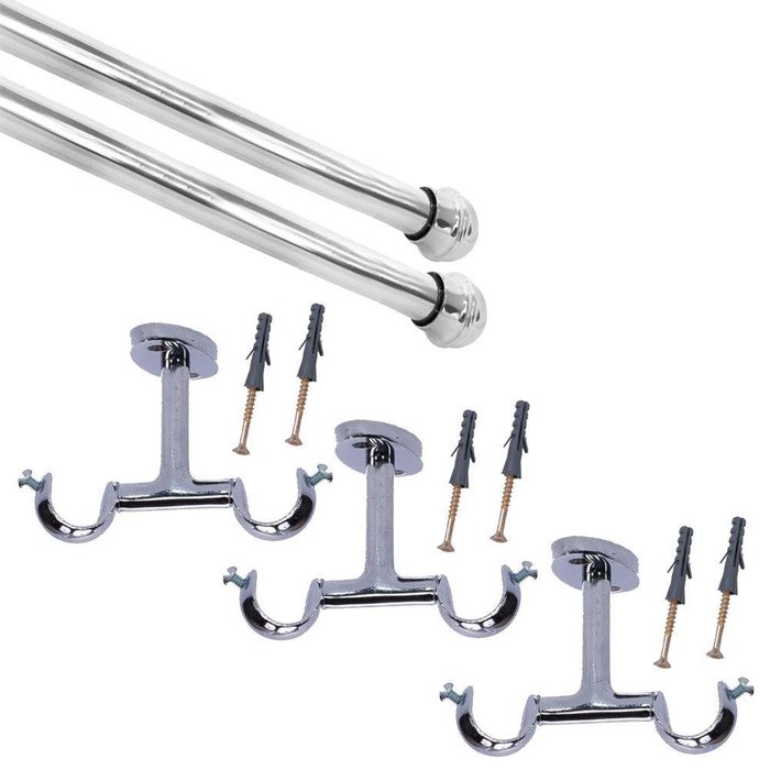Contém:2 Varão de 2,5 mts divididos em 3 partes de0,90 mt com 19mm de diametro3 Suportes Duplo de 19mm ferro Cromado para teto4 Ponteiras de Polipropileno