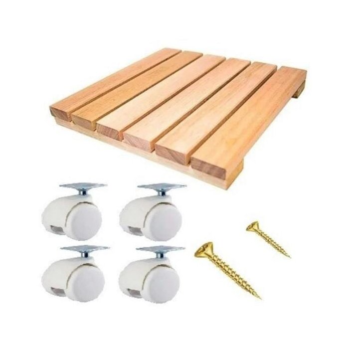 Kit 1 unidade de suporte em madeira Eucalipto com rodas Plásticas brancas para vaso ou botija de gás.