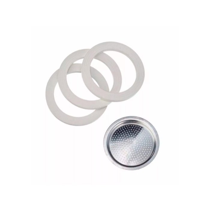 1 Kit C/3 Borrachas+ 1 Filtro Cafeteira Italiana 3 Xícaras O Kit com 1 filtro e 3 borrachas de vedação para capacidade de 12 xícaras é perfeito para você que ama degustar um bom café moka. O filtro serve para manter o aroma e o sabor do café e as borrachas oferecem vedação total, evitando que o vapor da água escape ou o ar entre.
