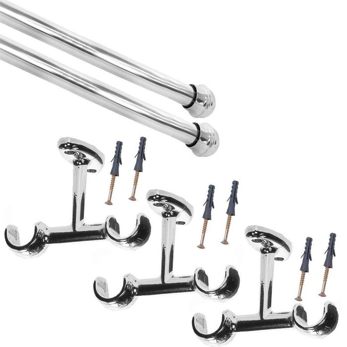 Contém:2 Varão de 4,00 mts divididos em 3 partes de1,33 mt com 19mm de diametro3 Suportes Duplo de 19mm aluminio Cromado para teto4 Ponteiras de Polipropileno