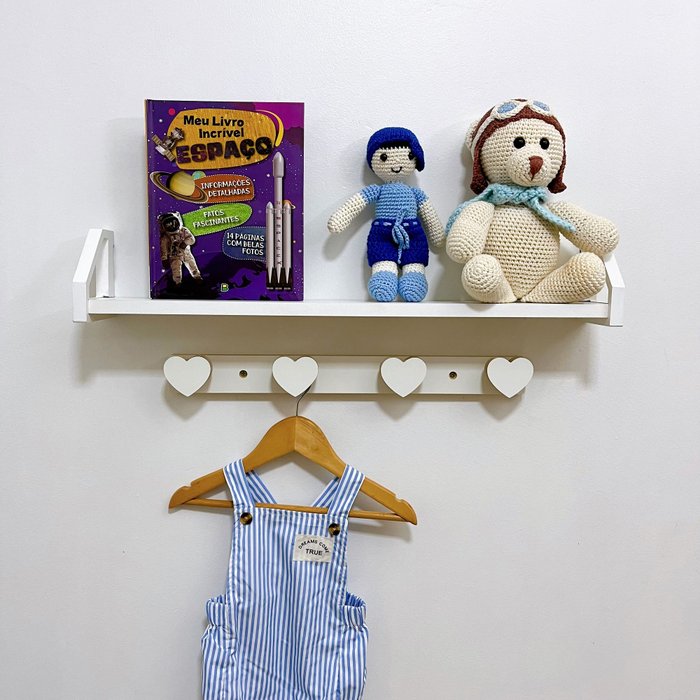 1 Prateleira Colorida Infantil 60cm e 1 Cabideiro Coração:branco Geométrico