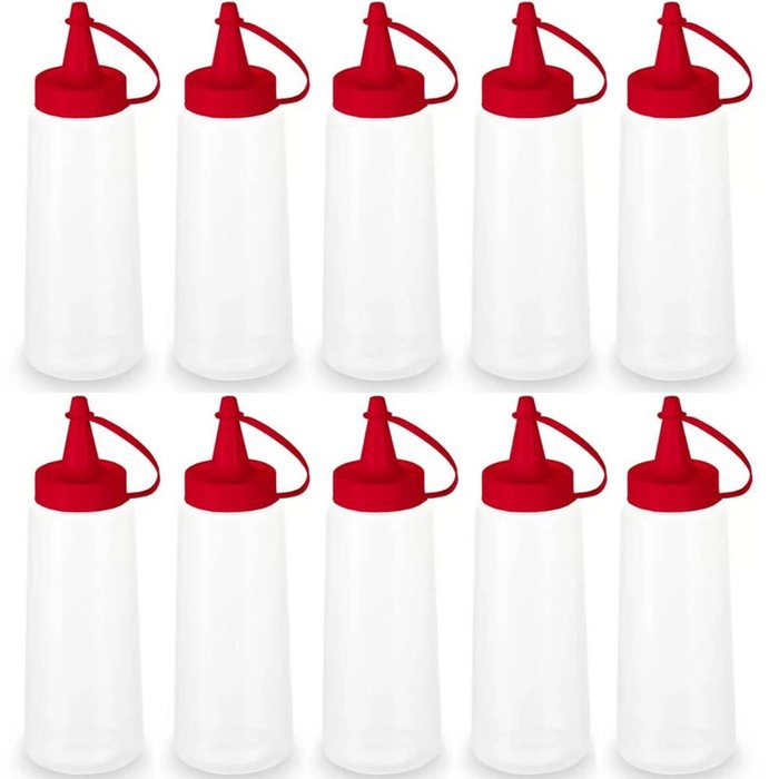 10 Bisnagas Plásticas Flexível para Lanchonetes Frascos de Molhos Ketchup Bico Vermelho transparente