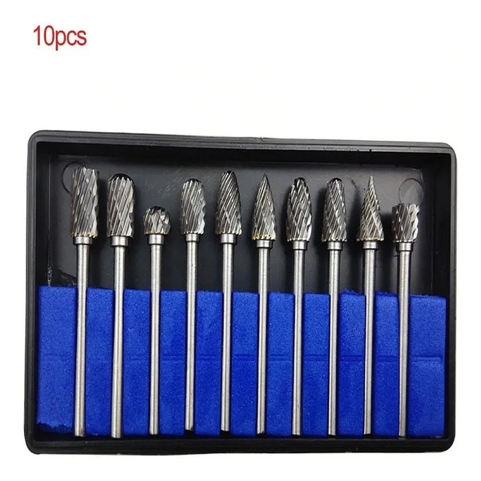 Kit com 10 fresas brocas lima em tungstênio para gravação, ideal para entalhe em madeira, ferro fundido, metais macios e etc. Para uso em furadeiras e micro retífica tipo dremel e outras marcas do mercado.