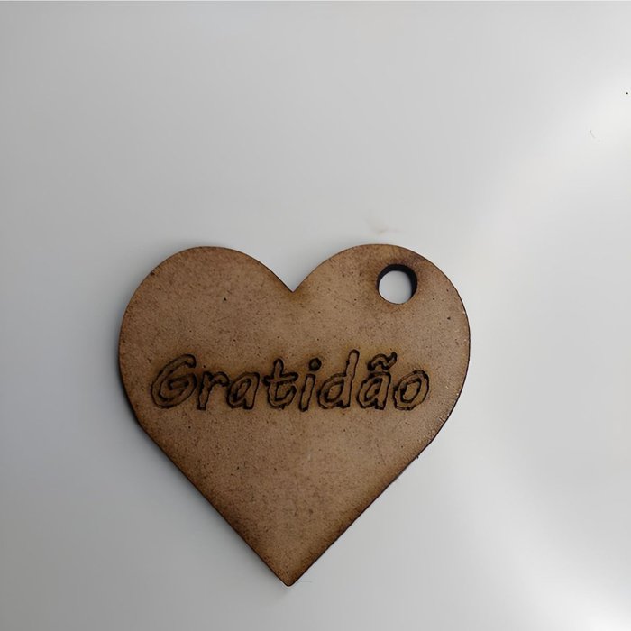 Chaveiro em MDF 3mm, cortado a laser em formato de coração, com a palavra “Gratidão” delicadamente gravada.