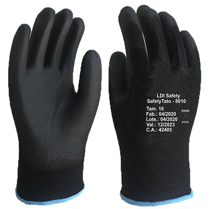 LUVA SAFETYTATO - 12 PARESLuva de segurança confeccionada em fibras sintéticas sem revestimento interno, recoberta em banho de poliuretano na palma e dedos, punho tricotado com elástico nas mesmas fibras, acabamento em overloque.
