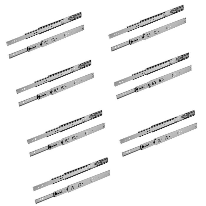Kit com 7 pares de corrediças telescópica para 7 gavetas, indicada para gavetas de cozinhas, closets, quartos, banheiros, lavanderias, prateleiras retráteis/extensíveis, bases de teclado e mobiliário em geral.
