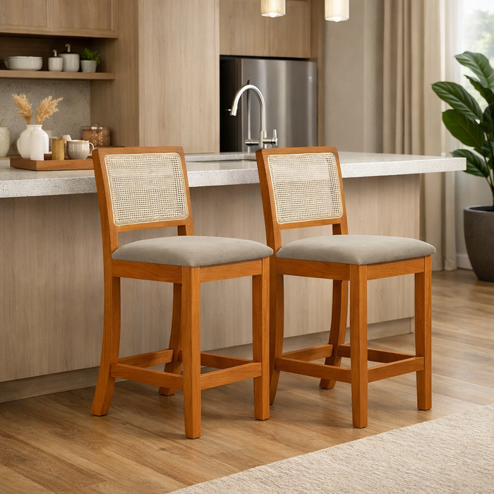 2 Banquetas Altas em Tela Sextavadas Assento Estofado Veludo Bege Rubi Madeira Maciça Mel