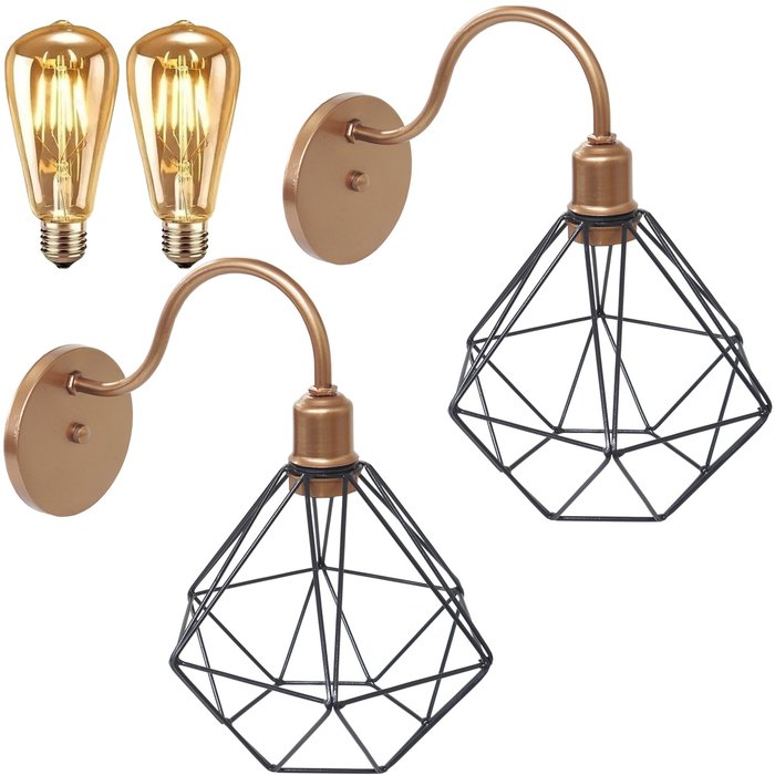 2 Luminárias Arandela Parede Aramada Diamante Industrial Retro + Lâmpadas Led Cobre Rose Gold/ Preto