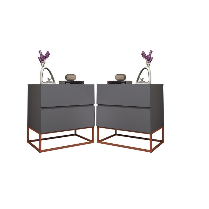 2 Mesas De Cabeceira Eros 45cm Puxadores Cava Com Pés De Metal Cinza/Cobre