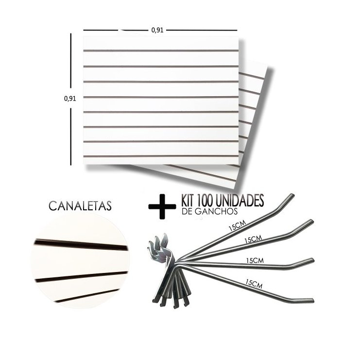 Kit contendo 2 (dois) Paineis Canaletados Expositor em MDF, também conhecido como SlatWall. Ideal para todos os tipos de loja! + 100 unidades de ganchos ZINCADOS 15cm + Canaletas na cor PRETO