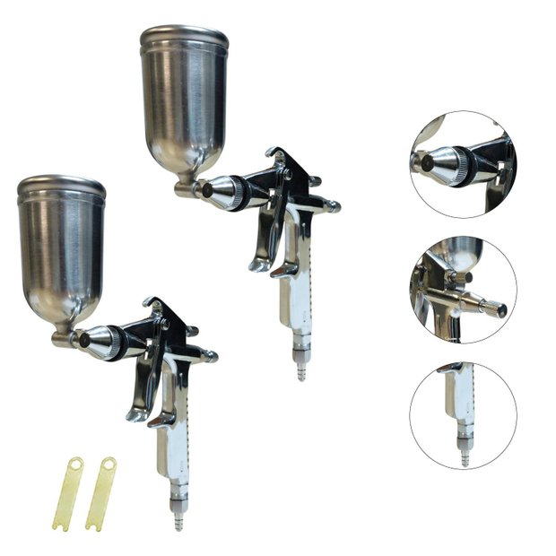 Especificações: - Material: alumínio - Pressão de trabalho: 3,0 - 4 bar / 22 - 60 psi - Largura padrão: 10 cm - Consumo de ar: 35 Litros/Min - Capacidade do copo alumínio: 125 ml - Tamanho bico: 0,5 mm - Entrada de ar: 1/4 (BSP/ nps/ NPT) Rosca