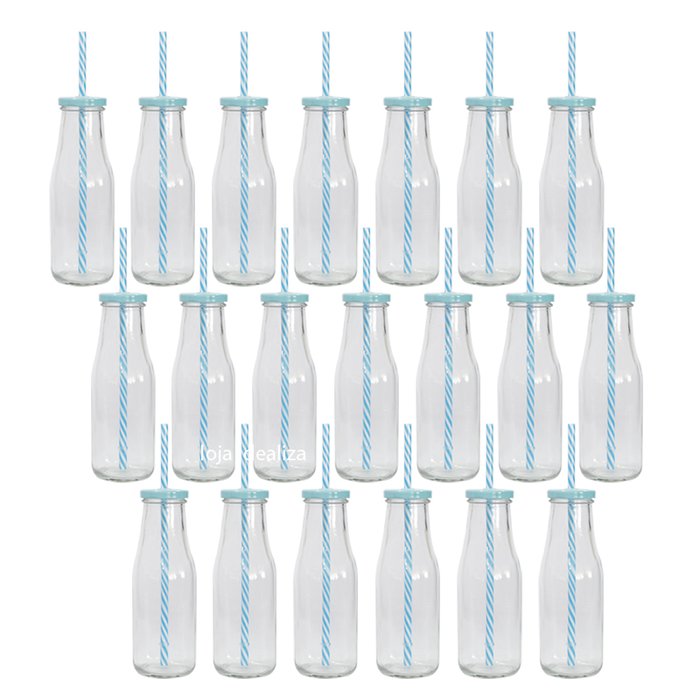 20 Garrafa Copo Vidro Suco Drink Shake Tampa Canudo 450ml Azul