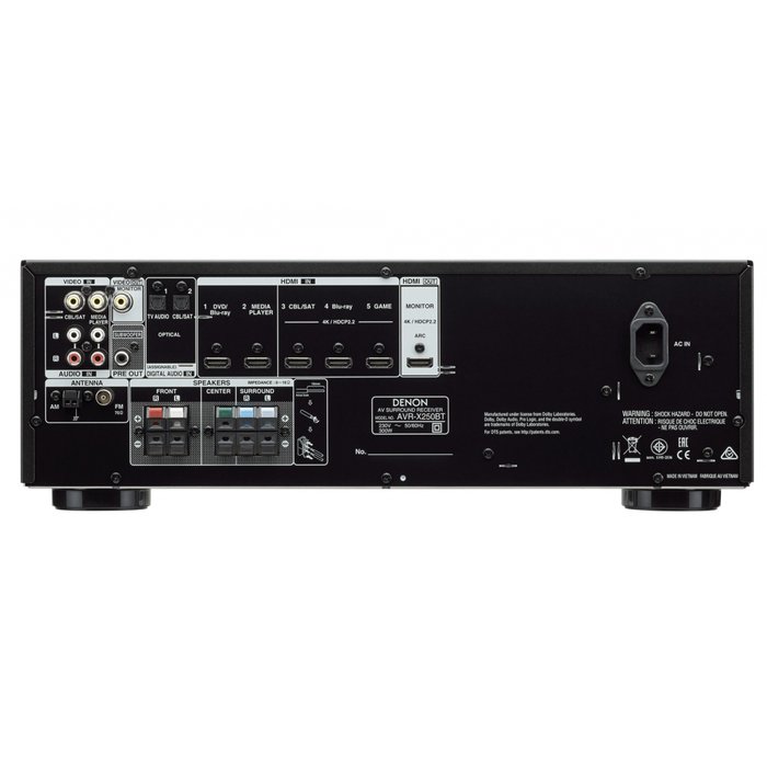 Com 130 W de potência por canal, o receptor AV Denon AVR-X250BT de 5.1 canais alimenta um home theater de qualidade acessível a todos. Assista aos seus programas favoritos com Full 4K Ultra HD e conecte facilmente seus componentes de mídia e sistemas de jogos às cinco entradas HDMI disponíveis - ou transmita música com Bluetooth integrado.