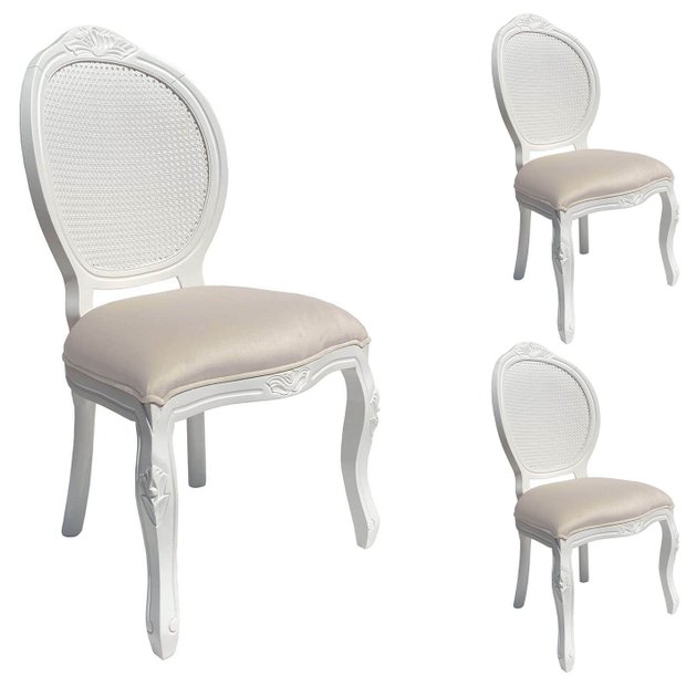 3 Cadeira Medalhão Madeira Entalhada com Tela Telinha Palhinha Poltrona Natural Provençal Indiana de branco