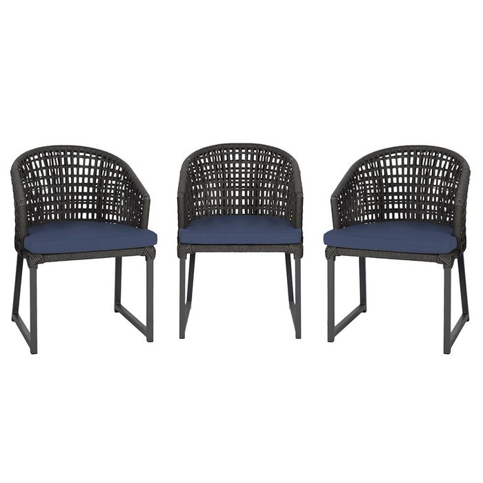 3 Cadeira Noronha Aluminio Micro Pintura Preta, Tr. Telinha Corda Nautica Preta, Estofado - Azul