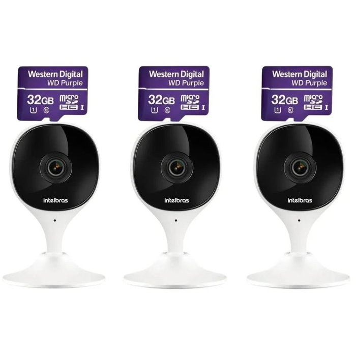 3 Câmeras de Segurança Mibo Imx C Resolução 2MP Wi-fi com Visão Noturna Intelbras Branca + Cartão de memória WD Purple 32gb Classe 10 Western Digital
