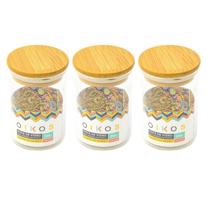 3 Potes De Vidro Hermético Pequeno Redondo 250Ml Tampa Bambu