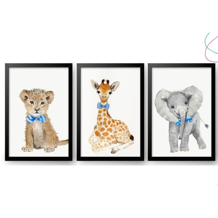 3 Quadros Decorativos Safari Aquarela baby filhotes:Preta