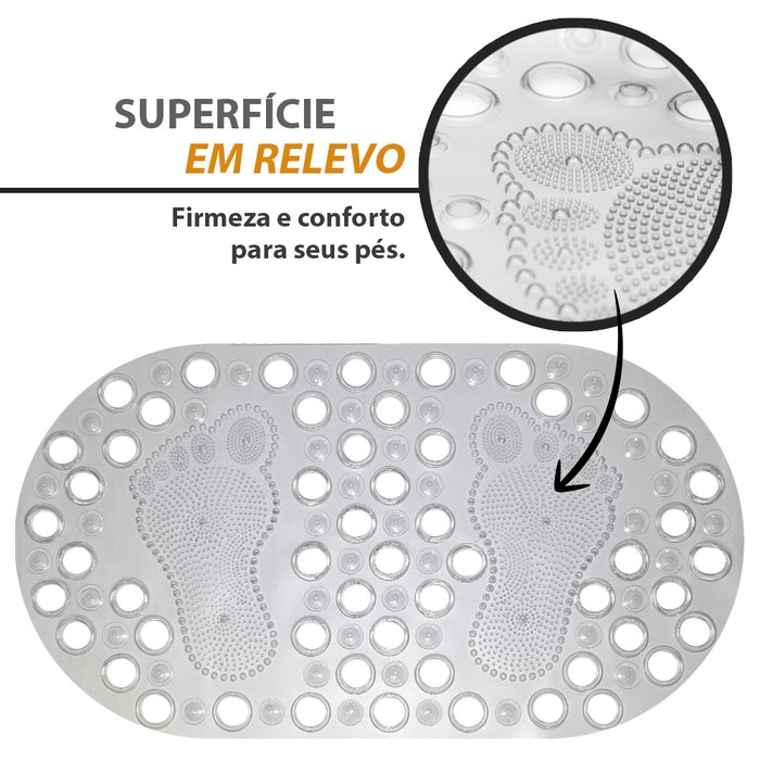 VANTAGENS:- Antimofo;- Massageia os pés;- Possui ventosas que aderem ao piso;- Mais segurança na hora do banho;- Superfície antiderrapante;- Firmeza e conforto para os pés;- Design moderno;- Combina com qualquer decoração.