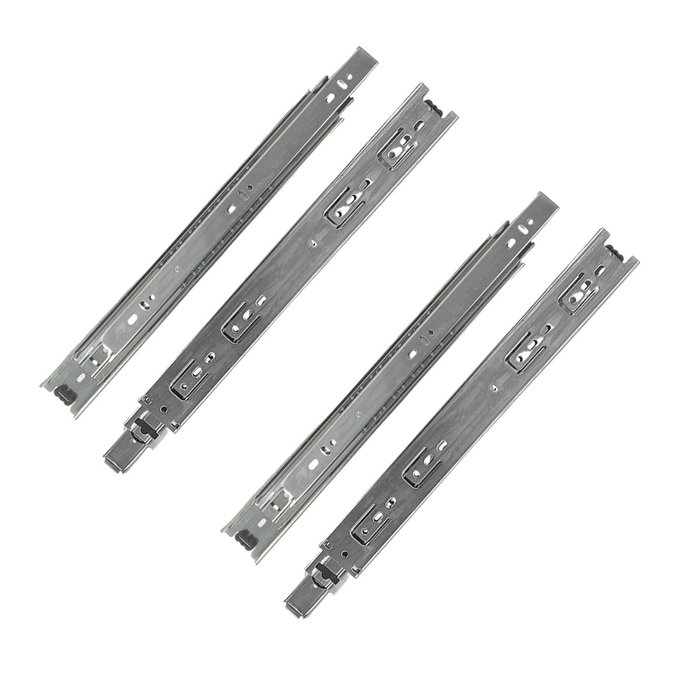 Kit com 4 Corrediças Pesada telescópica é indicada para gavetas de cozinhas, closets, quartos, banheiros, lavanderias, prateleiras retráteis/extensíveis, bases de teclado e mobiliário em geral, um par por gaveta. Suporta até 40kg.