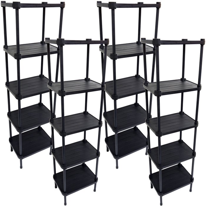 4 Estantes de Plástico Modular Multiuso 5 Prateleiras 1 Torre Preta Montável 65 Kg Qualyplas