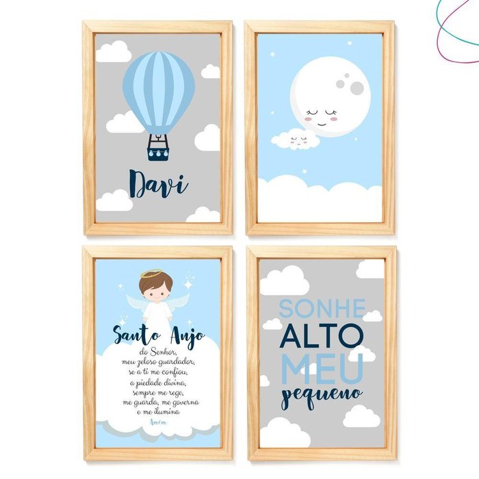 4 Quadros Decoração Quarto Menino Nuvem e Balão Santo Anjo Cor:pinus