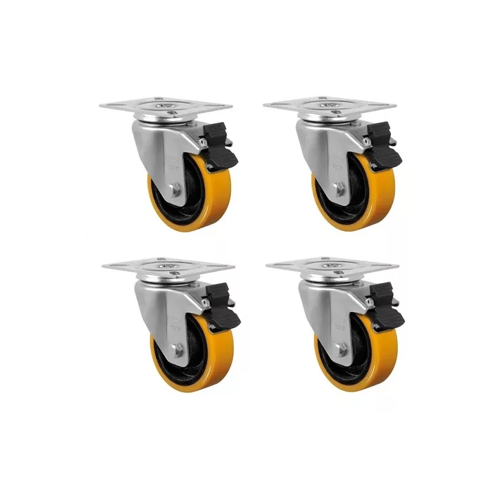 Kit com 04 Rodízios Giratórios Com Freio - Fixação de Placa - Roda 4? (414) de Ferro Fundido Revestido de Poliuretano Eixo Bucha de Nylon ? Schioppa ? 300kg por peça (kit c/ 04 peças carga total 1200kg)