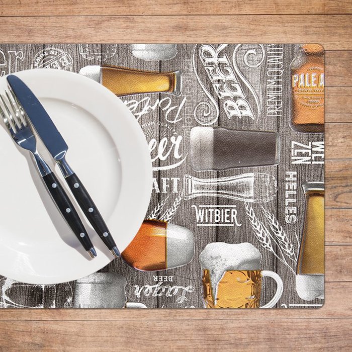 DUPLA FACE:- De um lado possui gravação em relevo que imita couro trançado rústico;- Do outro, estampa temática boteco/beer.