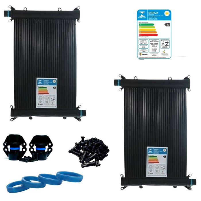 - Área: 0,9m² por coletor. Aquece 0,9m² de piscina (climas quentes).