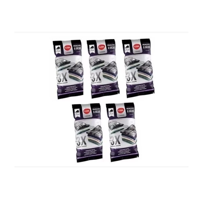 5 Sacos Embalagens À Vacuo, 3x Mais Espaço no Seu Guarda Roupa e Mala para Roupas Cobertores e Edredons Quantidade: 5 unidades Tamanho: 50 x 60cm Utiliza com seu aspirador de pó Produzido em pvc super resistente Hermético e reutilizável À prova de umidade Protege de mofo e odores Otimiza o espaço em sua mala ou guarda-roupas em até 3 x mais Modo de usar: 1) Insira na embalagem edredons, travesseiros, cobertores, casacos ou qualquer item que você desejar guardar e proteger. As peças devem ser totalmente secas, limpas e ocupar o espaço da embalagem até a linha pontilhada do zíper de fechamento. 2) Use um pano úmido para limpar o zíper de fechamento e coloque o feixe de plástico para instalá-lo. 3) Abra a válvula e encaixe seu aspirador de pó. VANTAGENS DO PRODUTO: - Proteger seu casaco, cobertor, roupas, edredons e etc de mofo, poeira e umidade. - Reduz em até 3 vezes o espaço da sua mala e guarda-roupa - Você pode reutilizar várias vezes - Protege suas roupas de odores fortes - Evitar que as roupas se danifiquem ao passar do tempo - Produto com garantia