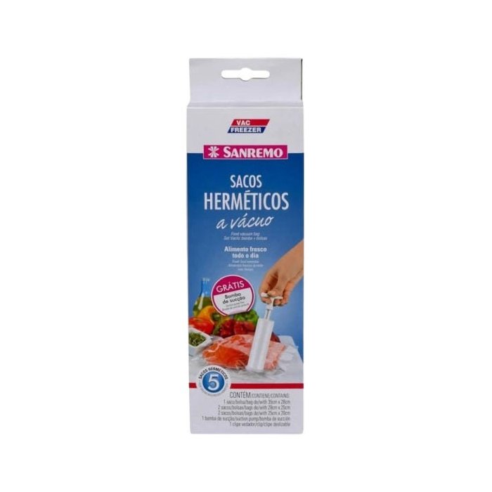 Esta embalagem contém 5 sacos herméticos com medidas distintas para suprir qualquer necessidade. São recomendados para guardar alimentos e manter os mesmos fresquinhos por mais tempo. A embalagem acompanha uma bomba de sucção que ao colocar o alimento dentro dos sacos, basta encaixar a bomba no local indicado que você poderá sugar todo ar, reduzindo-o de tamanho, organizando seus espaços de maneira rápida e funcional.