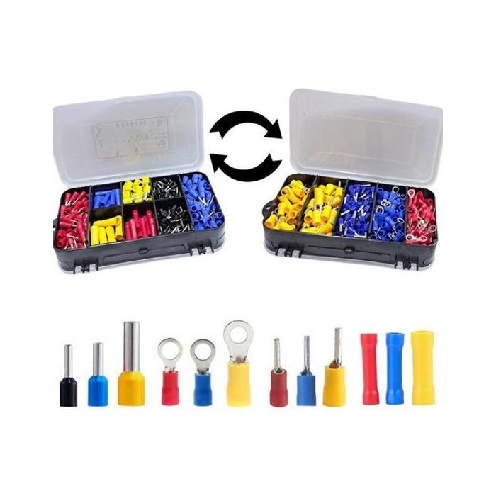Estojo com diversos terminal elétricos (ilhós, olhal, pino e luva) próprios para uso em eletroeletrônica, painéis elétricos, ligações de motores, máquinas, quadros de distribuição elétrica dentre outras, onde são exigidas dimensões reduzidas para contato e resistência a vibrações. Padrão de cores conforme norma din.