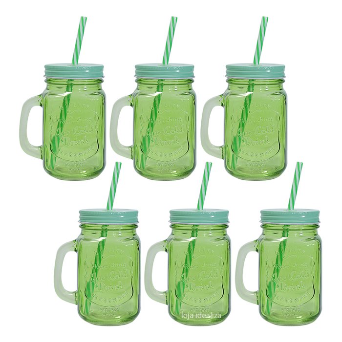 CANECAS DE VIDRO COLORIDO MASON JARS: DIVERTIDAS, VERSÁTEIS E PERFEITAS PARA QUEM QUER SERVIR COM ESTILO. Ideais para servir suco, cerveja, drinks, entre outras bebidas geladas ou quentes. Podem ser usadas em casa ou trabalho e combinam com diversos ambientes como restaurantes, lanchonetes, cafeterias, ente outros. Perfeitas para quem gosta de decorar, fazer um DIY e inventar novas utilidades para elas como vaso de flores, luminárias, lembrancinhas de festa e muito mais. PRINCIPAIS VANTAGENS:- As cores ajudam a identificar qual a sua caneca.- Prática e versátil.- Use com ou sem tampa.- Possui alça lateral para segurar.- Fácil de lavar.- Tampa com rosca.- Canudo com anel de segurança, não cai da caneca.- Deixa a sua casa, festa, comércio e decoração mais bonita. CONTÉM: 6 unidade(s) Material:- Caneca: Vidro Transparente Verde- Tampa: Metal Dimensões:- Altura com tampa: 13 cm- Largura com alça: 10,5 cm- Diâmetro da Boca: 6 cm- Capacidade: 480 ml até a boca. Um produto Idealiza Comércio de Utilidades.