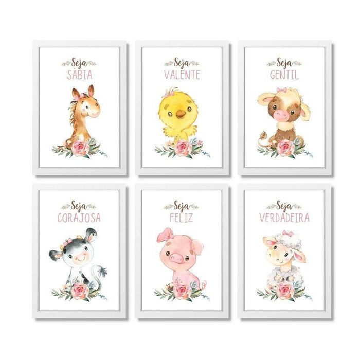 6 Quadros C/ Moldura Animais Da Fazenda Menina
