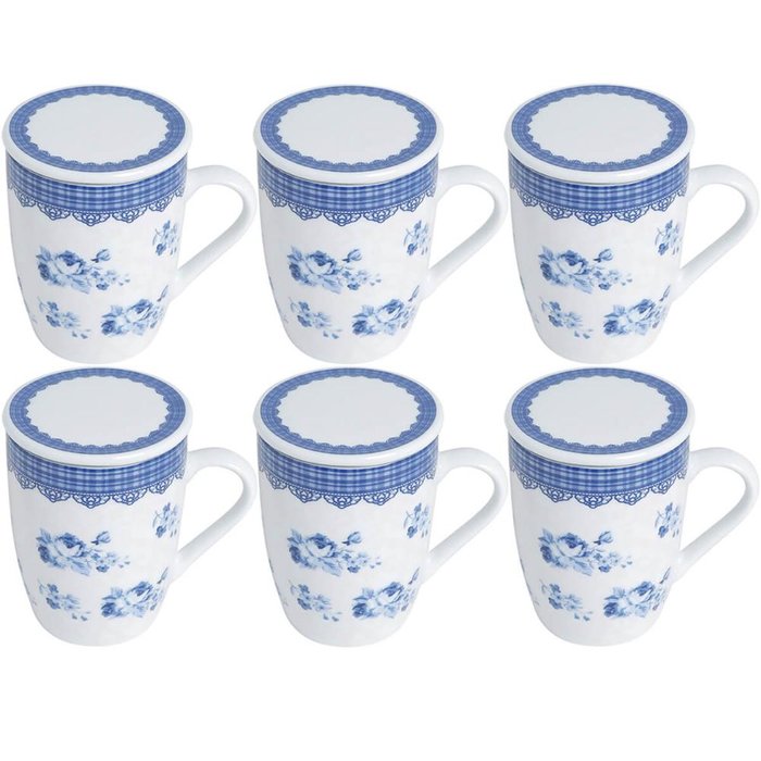 6 Xícaras de Chá Porcelana 310ml com Tampa Infusor Lyor Canecas Super White Grécia Branco, azul e rosa