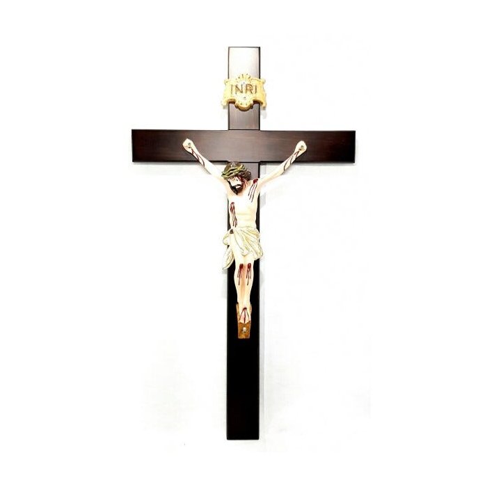 O Crucifixo de parede com Cristo em resina é uma robusta cruz em madeira natural de 70 cm de altura tratada com verniz fosco, com Cristo Crucificado em resina colorido à mão.
