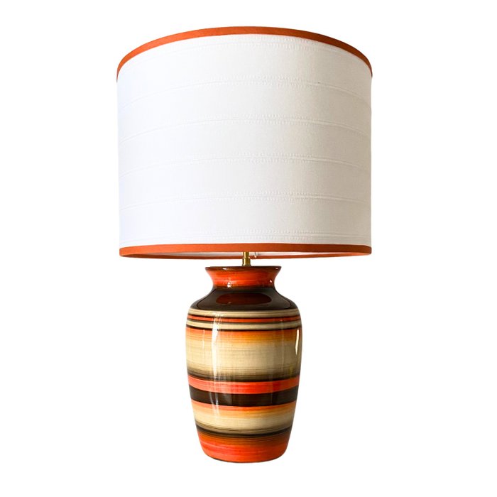 Vaso de cerâmica ppintada com faixas de cores horizontais (laranja,marrom e bege), tampa de madeira angelim pedra e suporte do soquete em latão.