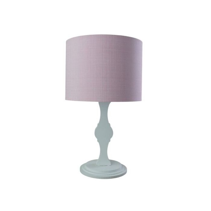 Abajur com base em madeira na cor branca e cúpula redonda revestida com tecido rosa bebê. Cúpula medindo 20cm de diâmetro e 15cm de altura.Dimensões do produto: Altura: 36cm Largura: 20cm. Bivolt. Usar lâmpadas fluorescentes ou LED. Bivolt. Fio branco com plug liga/desliga.