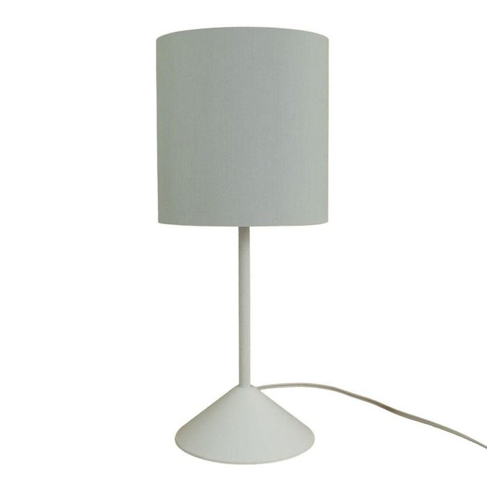 Abajur de mesa com base plástica na cor branca. Cúpula em tecido liso cinza claro.