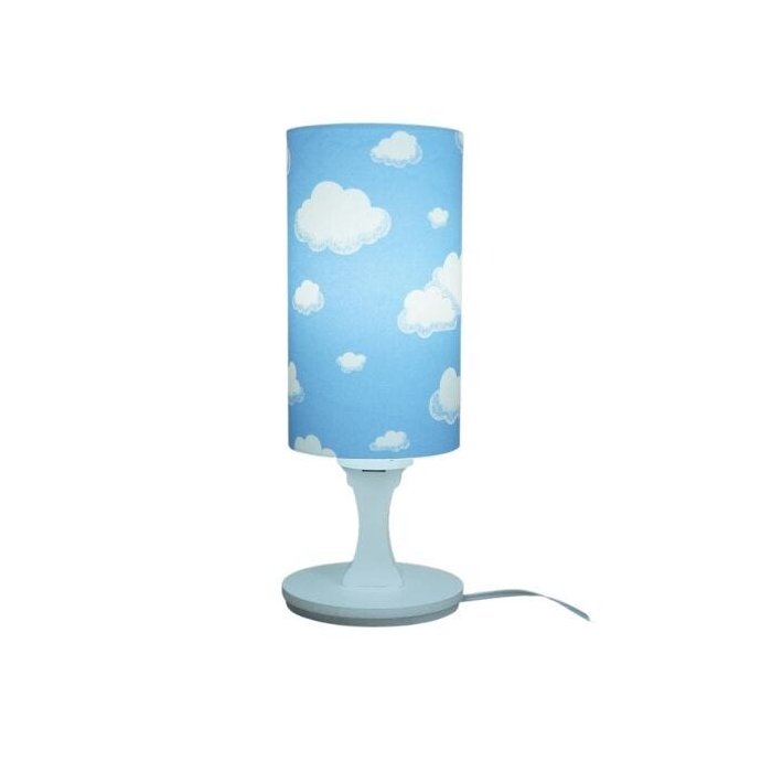 Abajur com cúpula em tecido nuvens em azul e branco. Base redonda em madeira pintada na cor branca. Altura: 30cm Largura: 11cm Bivolt Usar lâmpadas fluorescentes ou de LED.
