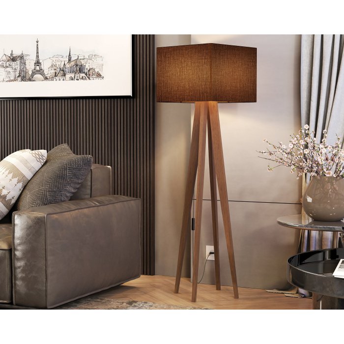 Abajur De Chão Luminária Bella Com Cúpula Quadrada E Pés De Madeira Retrô Marrom