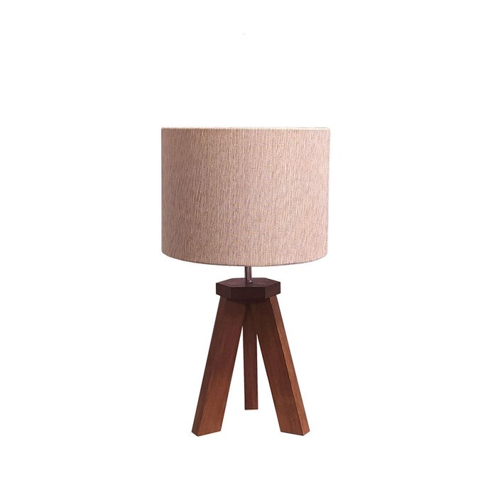 Luminária de Mesa Tripé, em madeira cedrinho e cúpula em tecido.