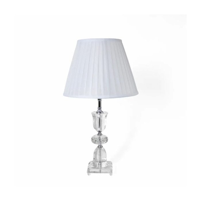 O Abajur deixa sua casa com a sensação de conforto e relaxamento. Pode estar em cima de uma mesa lateral, cômodas e aparadores, na sala ou quarto. Fabricado em vidro transparente sendo sua cúpula em tecido plissado e bivolt.