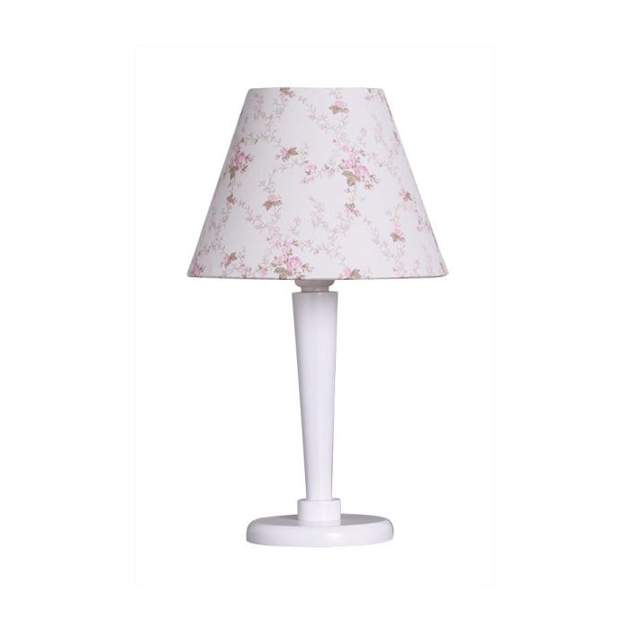 Abajur em madeira com pintura branca com brilho e cúpula floral com acabamento em tecido 100 por cento algodão.
