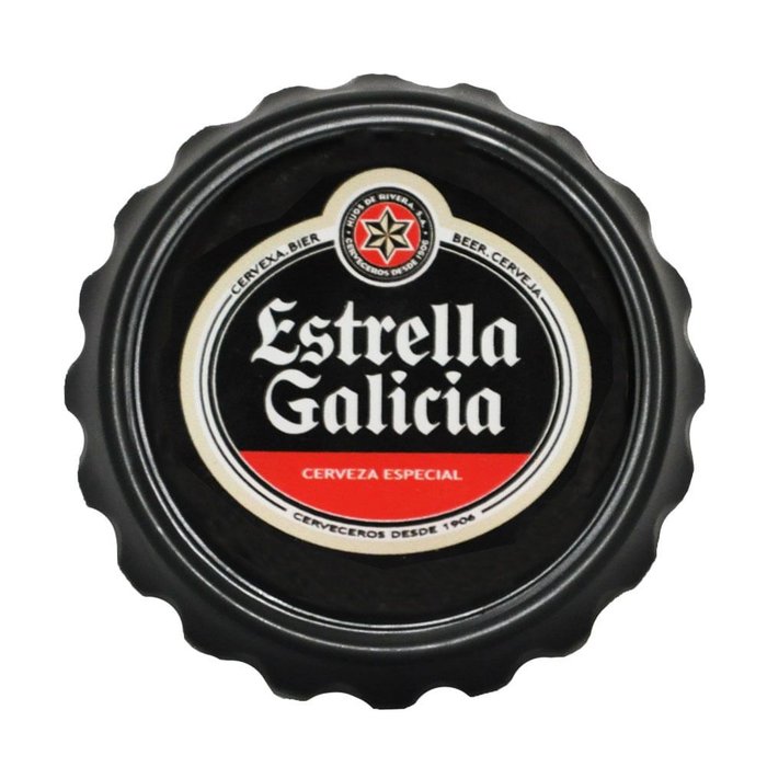 Feito em plástico com pintura preta o abridor tem parte metálica e ímãs para tornar mais fácil guardar a peça. Além disso, possui estampa do rótulo da cerveja Estrella Galicia.