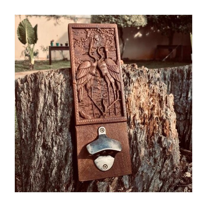 Abridor PANTANAL de parede feito em madeira de demolição, com imagem de garças em relevo 3D e abridor de garrafas em metal.