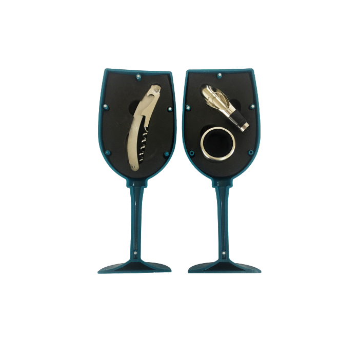 Este exclusivo Kit Vinho com formato de Taça com 3 peças em inox, com design moderno e inovador, seu feche de imãs deixa a peça com encaixe perfeito.