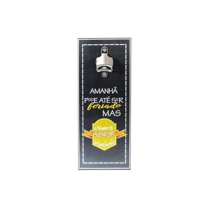 Descrição:Abridor de Garrafas de Parede.Abrigador de garrafa de cerveja feito em MDF 6mm, com estampa em papel colado, com a frase ”Amanhã pode até ser feriado, mas vamos abrir normalmente”, o abridor em metal fixado na peça é feito com material resistente, ideal para decorar áreas de lazer e bares.- Cor: Impressão colorida em papel- Fundo: MDF 6mm- Dimensão: altura 30cm, largura 12cm, profundidade 3,4cm- Fixação: Fita adesiva dupla face- Não acompanha bucha de fixação e parafuso- Frase: ”Amanhã pode até ser feriado, mas vamos abrir normalmente”- Ideal para pendurar em paredes- Peso aproximado: 0,240 gramas- Garantia: 90 dias contra defeito de fabricaçãoObservação: Limpar a superfície a ser fixada e aguardar 24 horas para exercer força ou colocar peso sobre a peça, para melhor aderência da fita adesiva na parede.