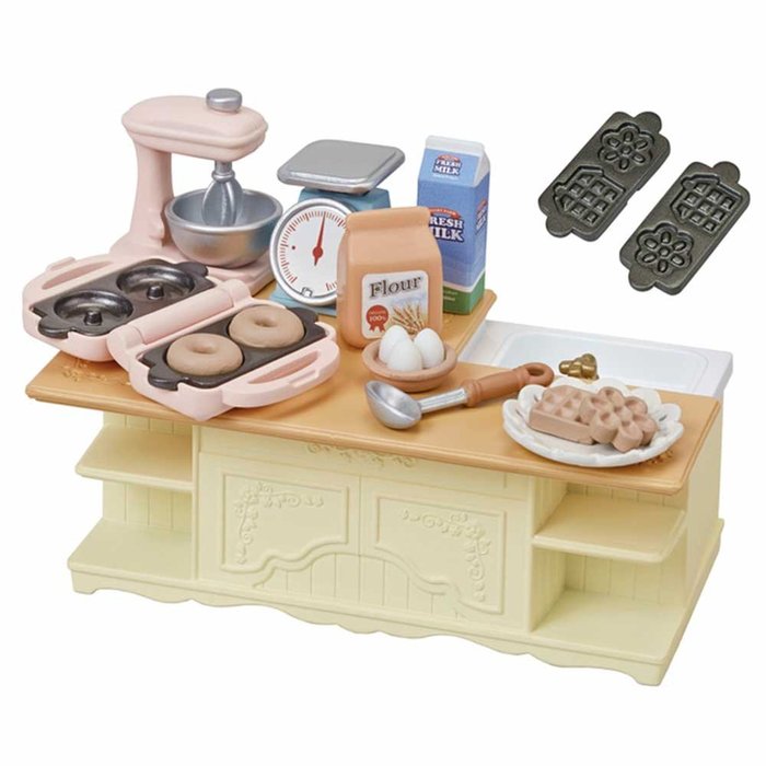 - Ilha de cozinha, Batedeira, Waffle e Donut Maker, Molde de waffles (superior, inferior), Molde de donuts (superior, inferior), Concha, Waffle (casa), Waffle (flor), Rosquinha x2, Ovos, Farinha, Tigela, Balança, Prato, Leite