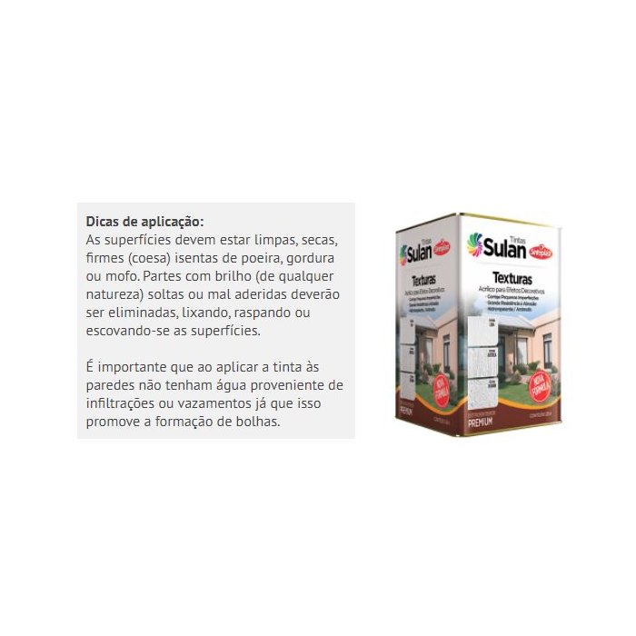 Descrição:Textura LisaProduto à base de Emulsão Acrílica, pigmentos, cargas minerais altamente selecionadas, e aditivos especiais. Produto encorpado proporciona enchimento capaz de disfarçar pequenas irregularidades da superfície tais como, emendas da argamassa, diferenças da macroporosidade do reboco, paredes de concreto, cimento, chapas pré-moldadas, paredes pintadas, possibilitando diversos desenhos decorativos.Textura DesignProduto encorpado, de elevada consistência, com alto poder de enchimento e muita versatilidade, capaz de disfarçar pequenas irregularidades da superfície tais como, emendas da argamassa, diferenças da macroporosidade do reboco, paredes de concreto, cimento amianto chapas pré-moldadas e paredes pintadas. De fácil aplicação, tem extraordinária resistência às intempéries. O Sulan Texturado Design dispensa a tinta de acabamento, apresentando alta durabilidade, hidrorepelencia e grande facilidade de manutenção.Textura RústicaProduto encorpado, de elevada consistência, com alto poder de enchimento e muita versatilidade, capaz de disfarçar pequenas irregularidades da superfície tais como, emendas da argamassa, diferenças da macroporosidade do reboco, paredes de concreto, cimento, chapas pré-moldadas e paredes pintadas. De fácil aplicação, tem extraordinária resistência às intempéries. Formulado à base de minerais com granulometria selecionada, de tamanhos variados, o Sulan Textura Rústica permite acabamento “RISCADO” altamente decorativo que dispensa a tinta de acabamento, apresentando alta durabilidade, hidrorepelencia e grande facilidade de manutenção.